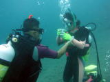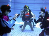 | さぁ、実際に器材を装着して、ダイビングの基本操作をやってみましょう! まずは足の届くところから始めるので、安心してくださいね |